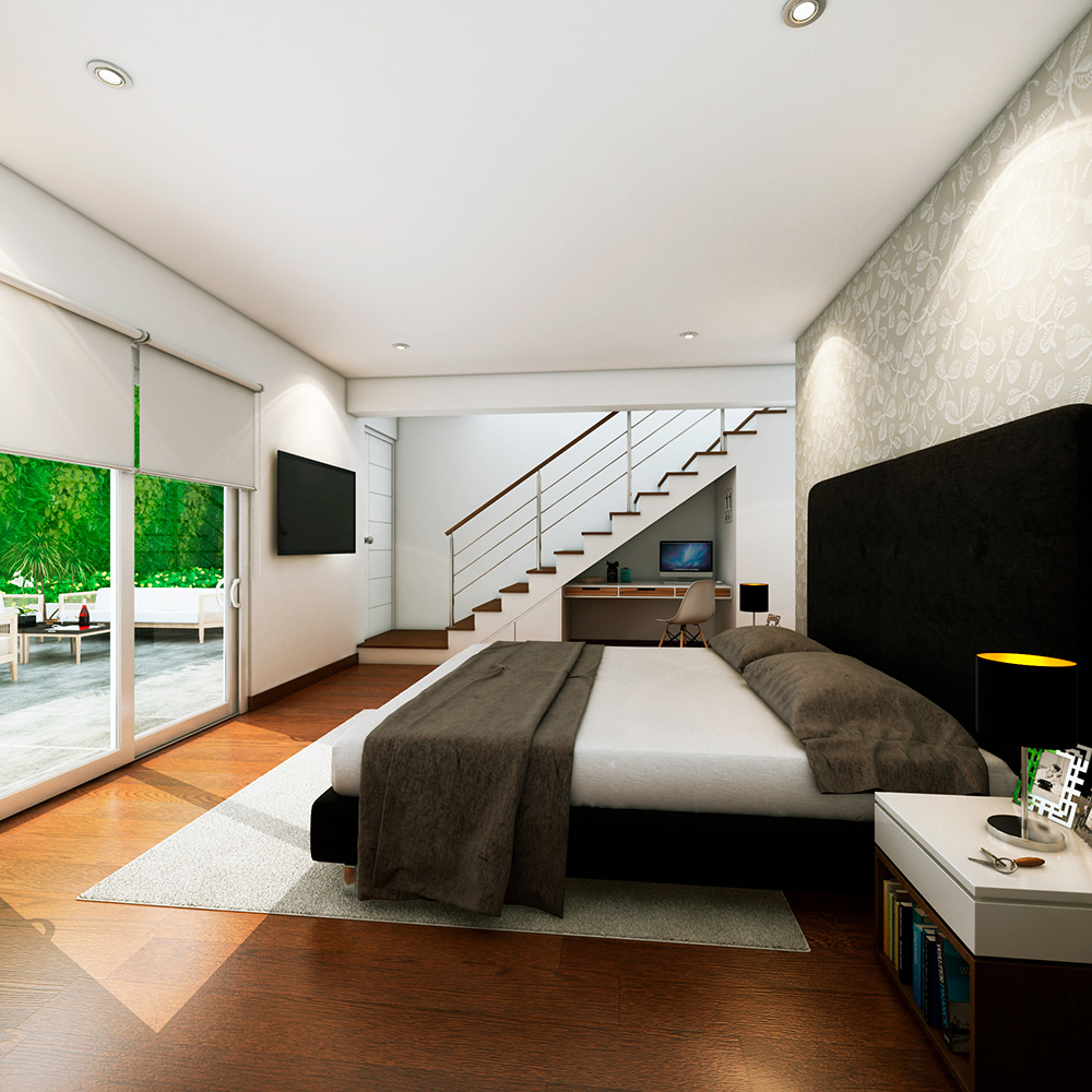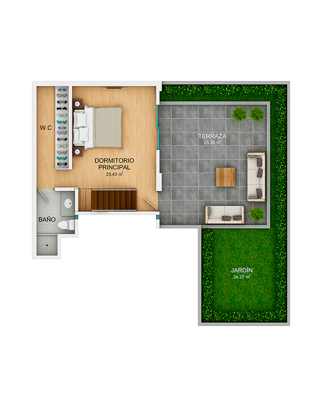 • 1 dormitorio con baño incorporado, walking closet, amplia terraza y jardín (piso 1)