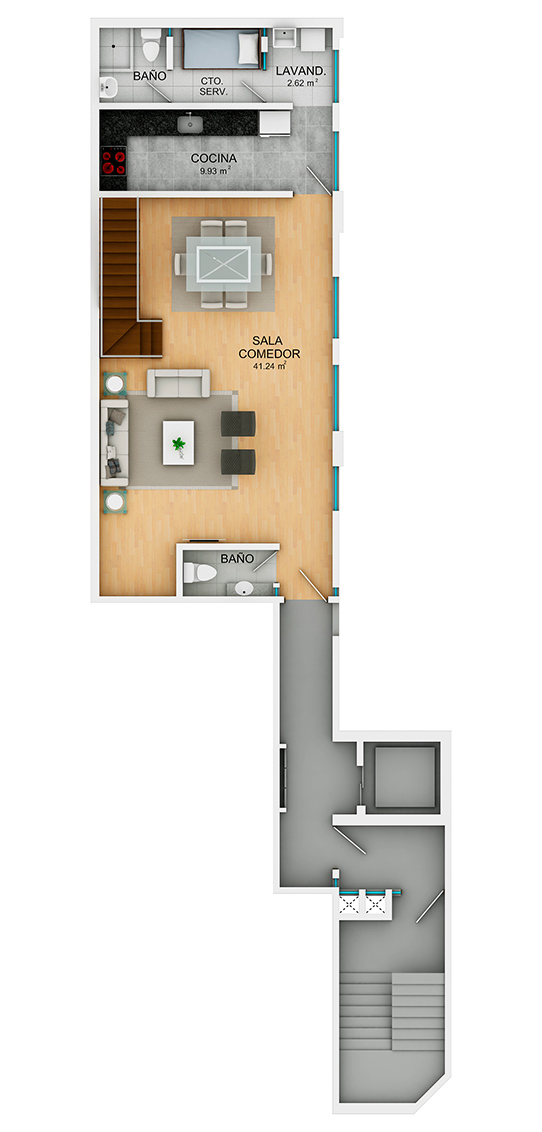 • Sala comedor, baño de visita, cocina y área de servicio en el primer nivel (piso 2)