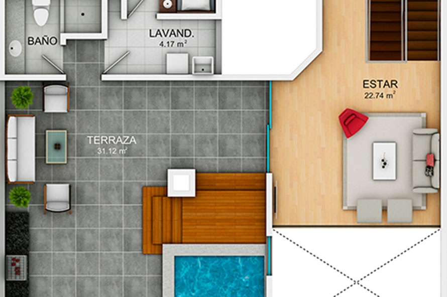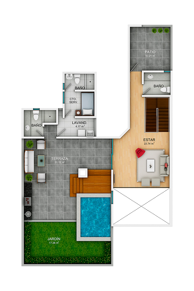 • Segundo Piso: cuenta con amplio estar, 2 terrazas, piscina con deck, baño de visita, baño completo para la piscina, parilla, jardín y área de servicio completa