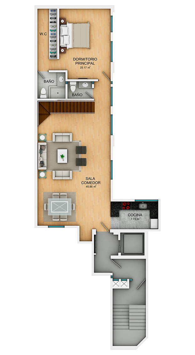 • 2 dormitorios y sala de estar en el segundo nivel