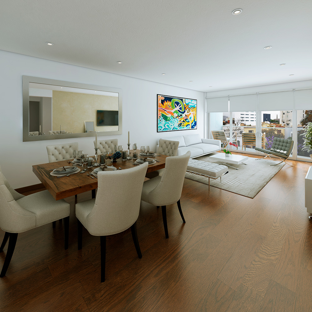 Adicionalmente los acabados tienen los altos estándares de nuestra empresa que incluyen ventanas y mamparas de PVC de la marca Ventanas & Estilos con cerrajería alemana que tienen una gran hermeticidad, rendimiento acústico y aislamiento térmico que es un distintivo de nuestros edificios, ascensor Otis personalizado de procedencia europea con paneles de acero martillado, acero negro e iluminación LED, griferías de cierre cerámico, sanitarios Villeroy & Boch y finos granitos.